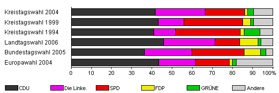 | Kreistagswahl 2004 | 58,8 | 41,6 | 24,9 | 19,5 | 1,5 | 2,8 | 9,7 | |
