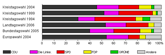 | Kreistagswahl 2004 | 60,6 | 45,8 | 18,5 | 16,7 | 10,6 | 2,3 | 6,0 | |