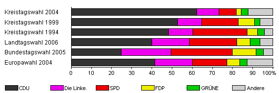 | Kreistagswahl 2004 | 57,8 | 62,3 | 10,9 | 8,6 | 2,4 | 3,6 | 12,1 | |