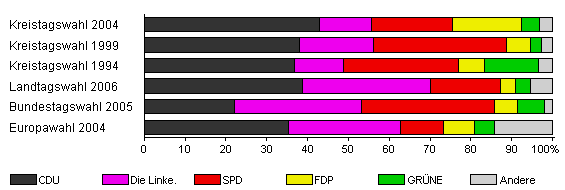 | Kreistagswahl 1999 | 72,6 | 38,1 | 18,1 | 32,4 | 5,9 | 2,7 | 2,7 | |