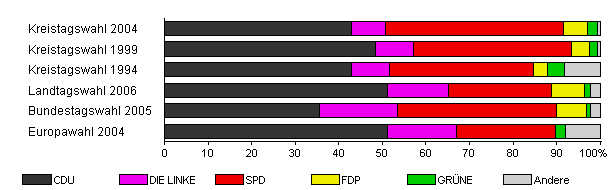 | Landtagswahl 2006 | 65,1 | 51,3 | 13,8 | 23,8 | 7,5 | 1,3 | 2,5 | |