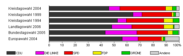 | Kreistagswahl 2004 | 57,0 | 45,8 | 8,7 | 35,1 | 5,3 | 2,9 | 2,2 | |