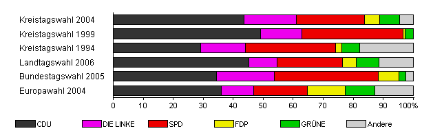 | Kreistagswahl 2004 | 49,6 | 43,6 | 17,4 | 22,9 | 5,0 | 6,6 | 4,4 | |