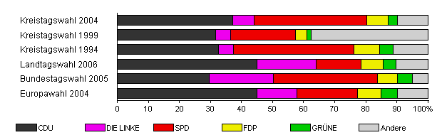 | Kreistagswahl 2004 | 50,3 | 37,1 | 6,9 | 36,3 | 7,0 | 3,0 | 9,7 | |