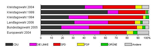| Kreistagswahl 2004 | 56,5 | 40,6 | 16,7 | 30,1 | 6,3 | x | 6,3 | |