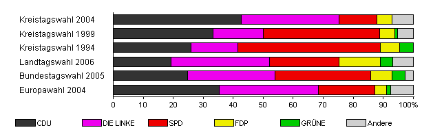 | Kreistagswahl 2004 | 46,4 | 42,6 | 32,6 | 12,8 | 5,0 | x | 7,0 | |
