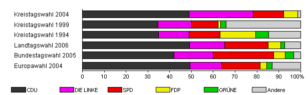 | Kreistagswahl 2004 | 56,6 | 49,0 | 29,3 | 13,9 | 6,4 | x | 1,4 | |