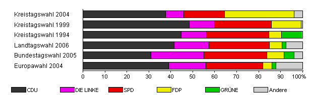 | Kreistagswahl 2004 | 59,7 | 37,7 | 8,1 | 18,8 | 31,6 | x | 3,8 | |