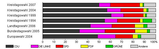 | Kreistagswahl 2007 | 33,7 | 49,7 | 10,3 | 25,9 | 2,6 | 1,0 | 10,6 | |