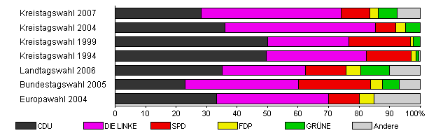 | Kreistagswahl 2007 | 64,3 | 28,3 | 45,9 | 9,4 | 2,7 | 6,2 | 7,5 | |