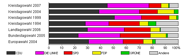 | Kreistagswahl 2007 | 36,4 | 45,2 | 32,1 | 9,4 | 5,9 | 0,6 | 6,8 | |