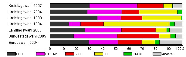 | Kreistagswahl 2007 | 35,6 | 29,8 | 36,2 | 19,9 | 6,8 | 0,4 | 7,0 | |