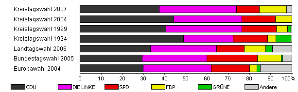 | Kreistagswahl 2007 | 39,9 | 37,5 | 36,4 | 10,7 | 12,9 | - | 2,5 | |
