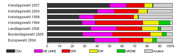 | Kreistagswahl 2007 | 41,8 | 49,9 | 13,5 | 14,3 | 6,3 | 0,7 | 15,3 | |