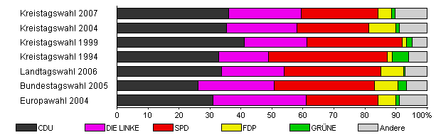 | Kreistagswahl 2007 | 40,2 | 36,0 | 23,5 | 24,7 | 4,4 | 1,1 | 10,2 | |