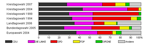 | Kreistagswahl 2007 | 31,0 | 27,6 | 34,6 | 12,7 | 10,1 | 3,5 | 11,4 | |