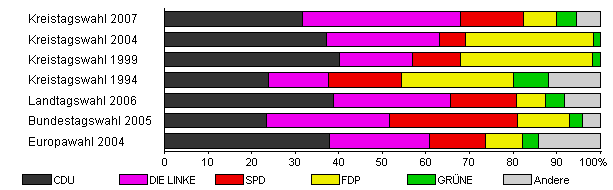 | Kreistagswahl 2007 | 37,6 | 31,6 | 36,3 | 14,5 | 7,7 | 4,4 | 5,6 | |