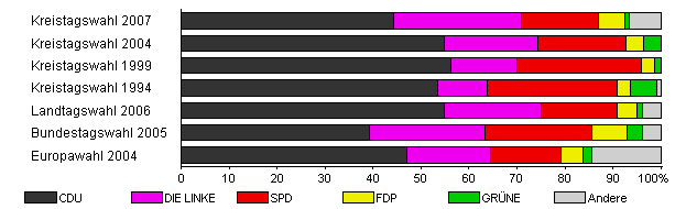 | Kreistagswahl 2007 | 54,5 | 44,3 | 26,6 | 16,1 | 5,4 | 1,1 | 6,6 | |