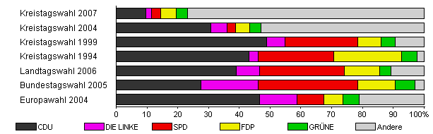 | Kreistagswahl 2007 | 53,0 | 9,6 | 1,9 | 3,0 | 5,1 | 3,5 | 76,9 | |