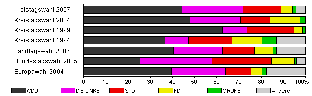 | Kreistagswahl 2007 | 43,9 | 44,2 | 27,6 | 17,2 | 5,1 | 1,7 | 4,2 | |