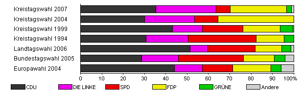 | Kreistagswahl 2007 | 81,0 | 35,3 | 28,4 | 6,5 | 26,5 | 2,2 | 1,1 | |