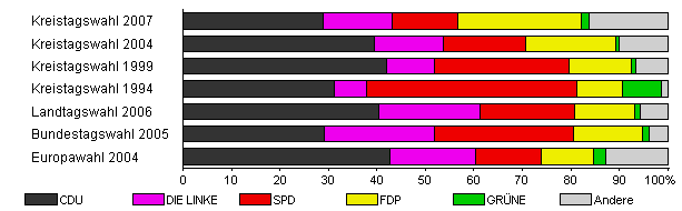 | Kreistagswahl 2007 | 40,6 | 28,9 | 14,3 | 13,5 | 25,5 | 1,5 | 16,3 | |