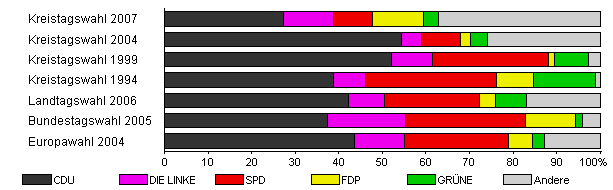 | Kreistagswahl 2007 | 26,2 | 27,2 | 11,7 | 8,9 | 11,7 | 3,3 | 37,2 | |