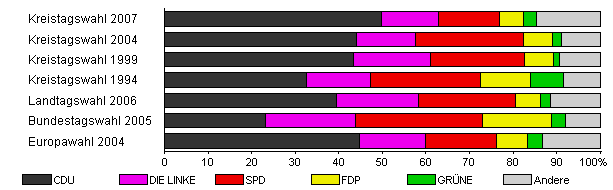 | Kreistagswahl 2007 | 38,8 | 49,9 | 13,1 | 13,8 | 5,6 | 3,0 | 14,7 | |