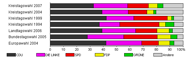 | Kreistagswahl 2007 | 47,1 | 32,6 | 25,8 | 15,5 | 6,8 | 4,2 | 15,1 | |