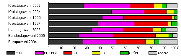 | Kreistagswahl 2007 | 42,5 | 27,3 | 36,0 | 18,7 | 6,2 | 3,3 | 8,6 | |