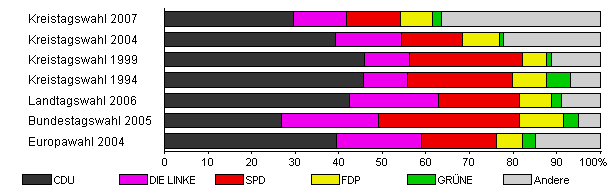 | Kreistagswahl 2004 | 51,1 | 39,2 | 15,3 | 13,8 | 8,7 | 0,8 | 22,1 | |