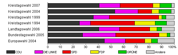 | Kreistagswahl 2007 | 39,2 | 40,6 | 16,5 | 26,0 | 5,4 | 9,3 | 2,3 | |