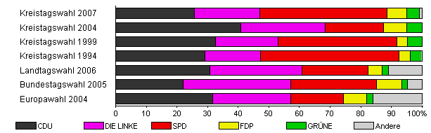 | Kreistagswahl 2007 | 47,2 | 25,6 | 21,4 | 41,5 | 6,6 | 4,0 | 0,9 | |