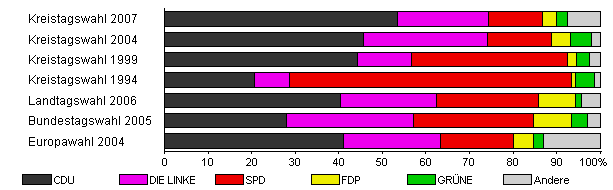 | Kreistagswahl 2007 | 39,0 | 53,4 | 20,9 | 12,5 | 3,3 | 2,4 | 7,6 | |