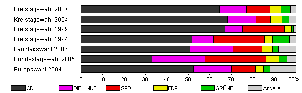 | Kreistagswahl 2004 | 50,6 | 68,2 | 13,4 | 6,7 | 5,4 | 3,1 | 3,2 | |
