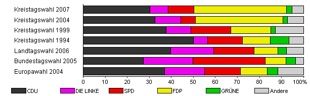 | Kreistagswahl 2007 | 44,2 | 30,4 | 8,2 | 11,6 | 42,0 | 2,6 | 5,2 | |