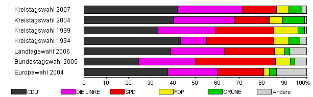 | Kreistagswahl 2007 | 31,7 | 41,9 | 29,3 | 15,4 | 5,5 | 6,0 | 2,0 | |