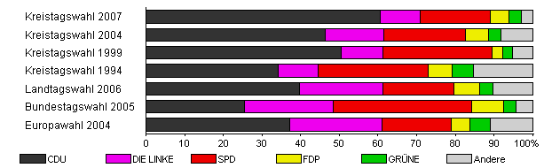 | Kreistagswahl 2007 | 37,4 | 60,7 | 10,3 | 18,0 | 4,9 | 3,3 | 2,8 | |