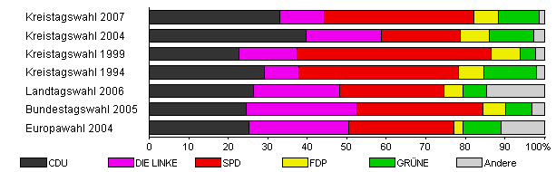 | Kreistagswahl 2007 | 40,2 | 33,0 | 11,2 | 37,9 | 6,3 | 10,2 | 1,5 | |