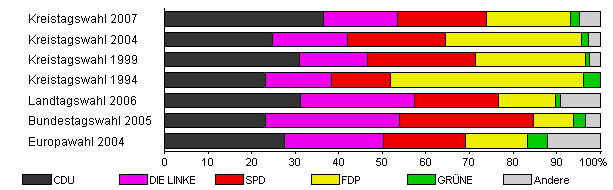| Kreistagswahl 2007 | 69,7 | 36,4 | 17,1 | 20,4 | 19,3 | 2,0 | 4,9 | |