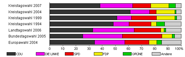 | Kreistagswahl 2007 | 33,8 | 38,4 | 24,7 | 13,9 | 13,7 | 5,1 | 4,3 | |