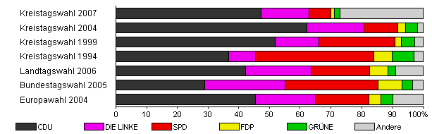 | Kreistagswahl 2007 | 34,4 | 47,2 | 15,8 | 6,9 | 1,2 | 2,0 | 27,0 | |