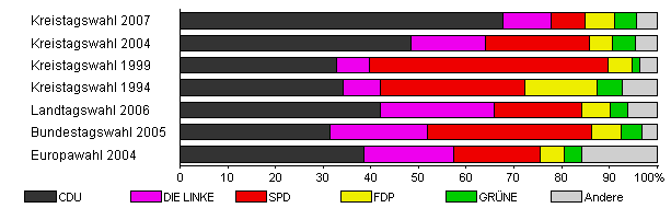 | Kreistagswahl 2007 | 48,3 | 67,7 | 10,2 | 7,1 | 6,1 | 4,7 | 4,2 | |