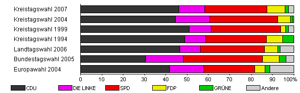| Kreistagswahl 2007 | 40,1 | 46,1 | 12,3 | 29,1 | 8,5 | 1,6 | 2,4 | |