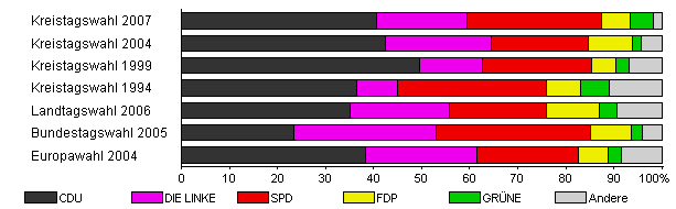 | Kreistagswahl 2007 | 23,2 | 40,6 | 18,8 | 28,0 | 6,1 | 4,7 | 1,9 | |