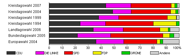 | Kreistagswahl 2007 | 33,6 | 43,6 | 19,4 | 30,8 | 2,9 | 1,8 | 1,5 | |