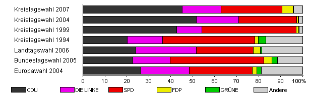 | Kreistagswahl 2007 | 45,1 | 45,2 | 17,7 | 27,8 | 5,0 | 0,3 | 4,0 | |