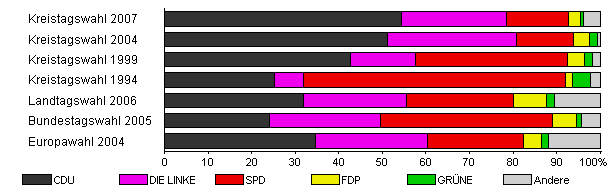 | Kreistagswahl 2007 | 45,3 | 54,5 | 24,1 | 14,1 | 2,8 | 0,7 | 3,8 | |