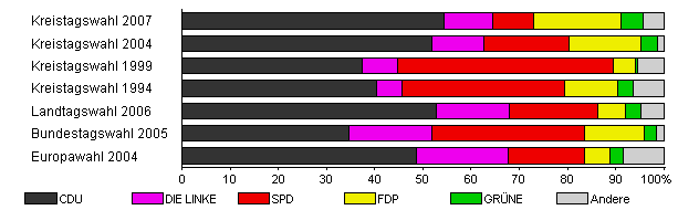 | Kreistagswahl 2007 | 47,3 | 54,5 | 10,0 | 8,5 | 18,2 | 4,5 | 4,2 | |