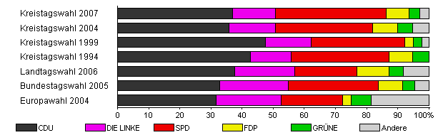 | Kreistagswahl 2007 | 34,9 | 37,0 | 13,8 | 35,4 | 7,4 | 3,4 | 3,0 | |